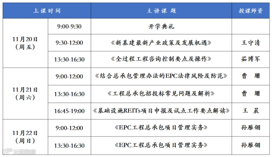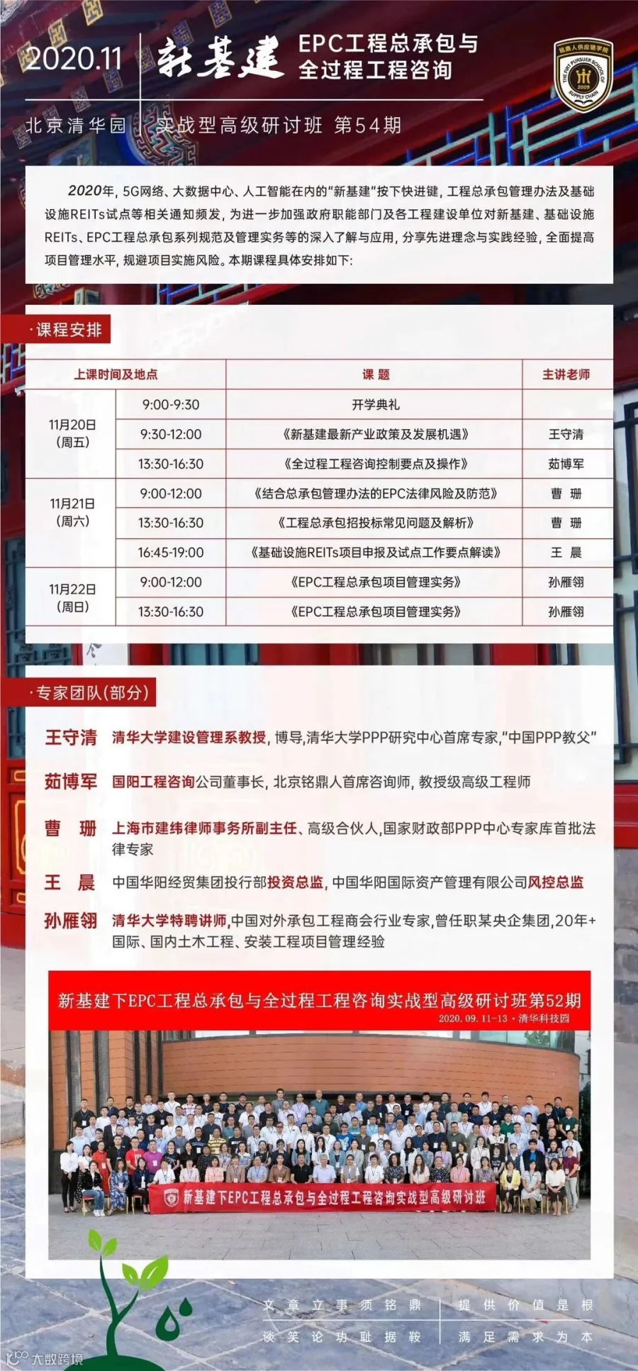 各位同学,您好!《新基建下EPC工程总承包与全过程工程咨询实战型高级研讨班》第54期定于2020年11月20日-22日于北京·清华科技园开课。请您合理安排时间,提前联络教务老师。