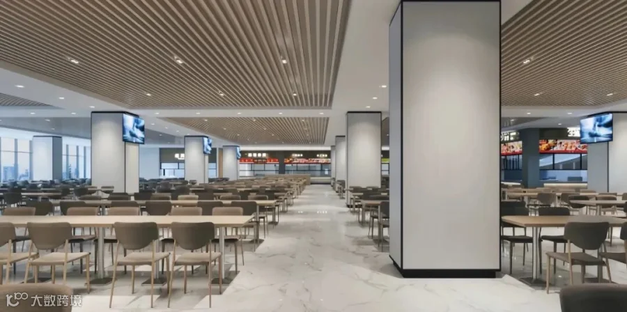 环境体验升级: 现代化空间设计,恒温26℃舒适环境,更增设影音设备轮播园区资讯及热点赛事,打造集用餐、交流、信息获取于一体的高品质空间。