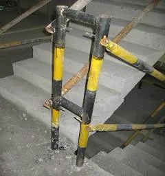 楼梯护栏设置要求:采用可拆卸水管护栏,高度≥1.2m;临边超过3m落差的楼梯必须挂网及底部安装180mm高踢脚板,踢脚板采用≥9mm厚胶合板制作。