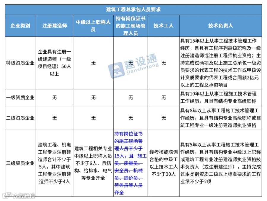 换句话说,并不是所有企业资质都不要求有建造师等企业人员。施工总承包三级资质企业对建造师等人员仍有要求,一级资质、二级资质企业保留技术负责人这一项要求,特级资质另有规定。