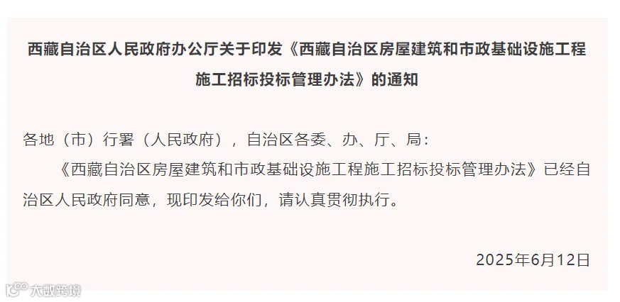 近日,西藏自治区人民政府办公厅发布关于印发《西藏自治区房屋建筑和市政基础设施工程施工招标投标管理办法》的通知。