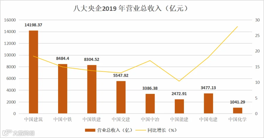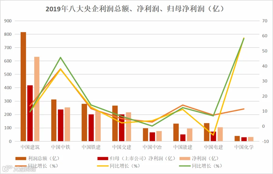 从图表可知,2019年八大建筑央企营业收入增长情况良好,尤为突出的是中国化学27.9%的增长率。营收增长是企业能否长久发展之根本,将为企业带来稳定持续的现金流,让企业进入良性循环…
