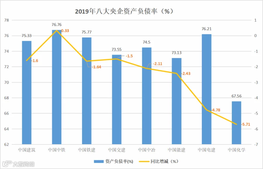 中国化学、中国电建资产负债率比去年同期分别降低了5.7%、4.8%;中国建筑、中国铁建、中国交建、中国中冶、中国能建比去年同期下降了1-3个百分点;中国中铁资产负债率相比较去年同期,则微微上涨了0.3%。