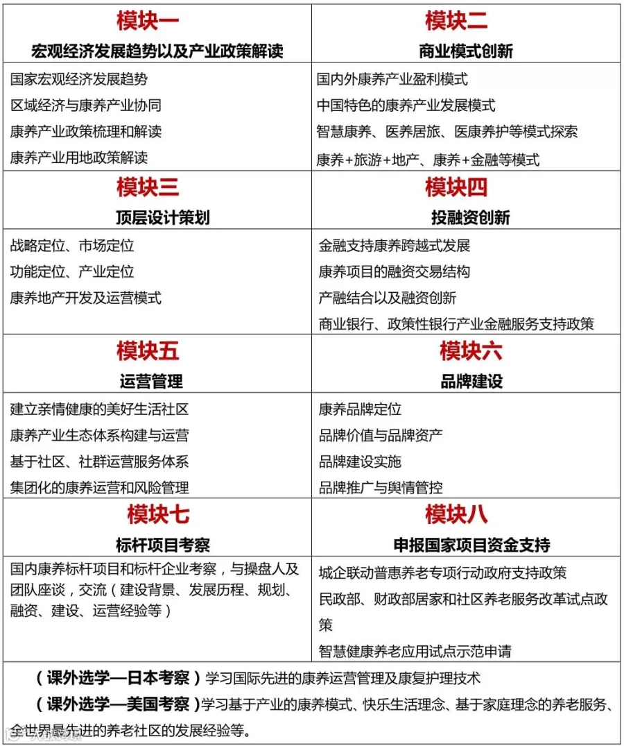 近年来,中国康养产业发展的政策环境逐渐完善,老龄化日益加深,而由于我国康养产业尚处于发展的初级阶段,行业不仅缺乏商业模式,更缺乏领军人才,北京大学举办北京大学康养产业领军人才研修班,构建从行业政策、商业模式、顶层策划、投融资、运营、品牌营销等系统课程体系,致力于探索产业全方位服务为一体的康养+多产业运营模式与解决方案,汇集康养产业主管领导、权威行业专家、领军企业家、资本大家、研究学者等,助力发展引领中国康养产业发展的主力部队。总结了几大亮点,推荐给大家: