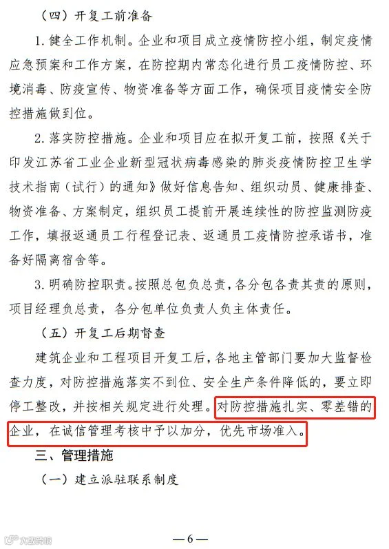 复工后,加大监督检查力度,对防控措施扎实、零差错的企业,在诚信管理考核中予以加分,优先市场准入。