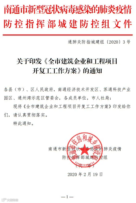 全市建筑工地自2020年2月20日起,即可全面组织复工。