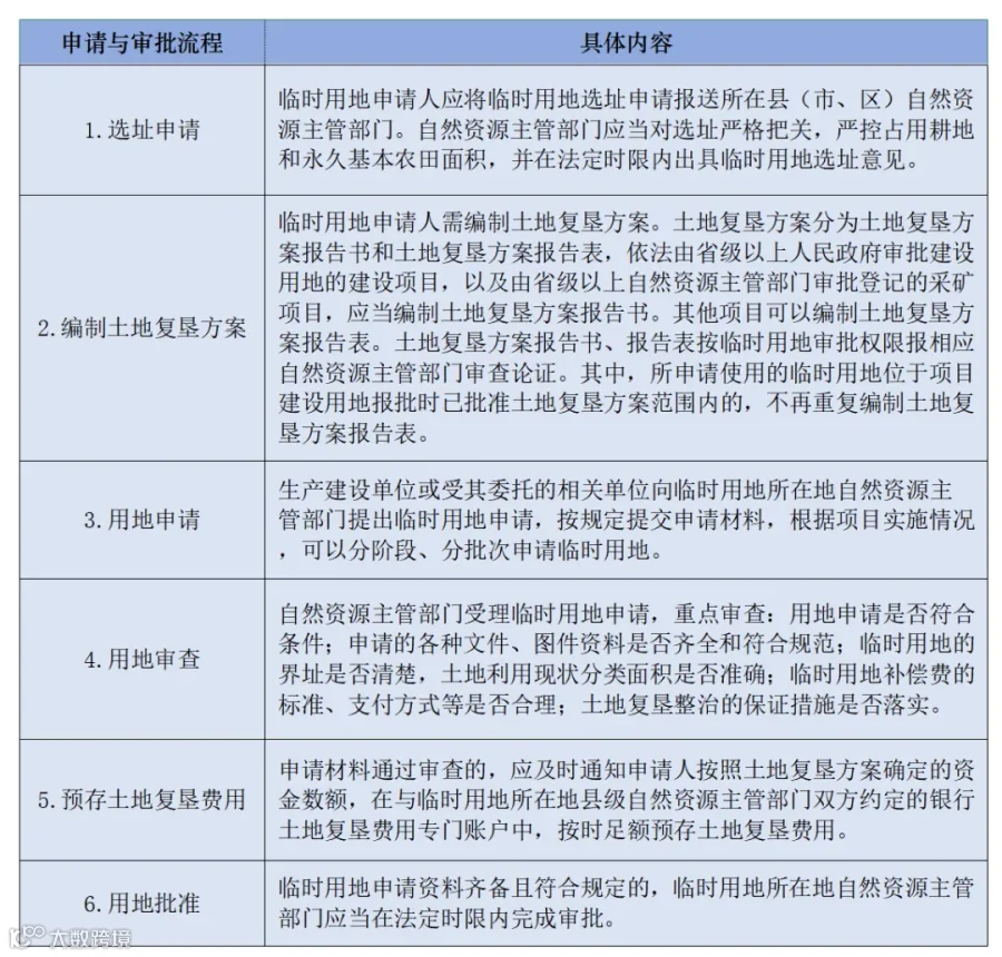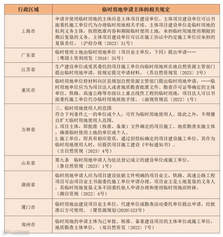 根据“2号文”的规定,申请临时用地应当提供临时用地申请书、临时使用土地合同、项目建设依据文件、土地复垦方案报告表、土地权属材料、勘测定界材料、土地利用现状照片及其他必要的材料。各地在“2号文”的基础上依据地方项目审批流程和行政职能,增加了其他申请材料,建议临时用地申请单位基于项目选址,根据属地主管部门的要求准备申请材料,避免缺漏、重复。