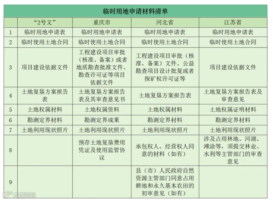 如下图所示,除“2号文”要求提交的7项申请材料外,重庆市规划和自然资源局在《关于规范临时用地管理的通知》(渝规资规范〔2022〕1号)中规定用地单位还须提交“预存土地复垦费用及使用监管协议”;河北省自然资源厅印发的《河北省临时用地管理办法》(冀自然资规〔2022〕2号)中新增了两项申请材料,一是临时使用承包土地和其他方式经营的国有农用地的,提交征得承包权人、经营权人同意的材料;二是市辖区外申请临时用地涉及占用耕地和永久基本农田的,提交县(市)人民政府自然资源主管部门初审意见。江苏省自然资源厅在《关于规范临时用地管理的通知》(苏自然资规发〔2023〕3号)中明确,涉及占用林地、河湖、滩涂等,还须提交林业、水利等主管部门的审查意见。其他省市有特殊规定的,亦应遵照执行。