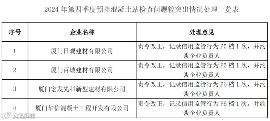 厦门市住建局通报,对存在问题较突出的厦门日观建材有限公司、厦门百城建材有限公司、厦门宏发先科新型建材有限公司、厦门华信混凝土工程开发有限公司记录批评类信用监管行为,并约谈企业负责人。并通报,部分检测机构在委托受理、仪器设备及试验环境、试验过程等环节存在一些问题。对存在问题较突出的福建省尚安检测技术有限公司记录批评类信用监管行为,并约谈企业负责人。