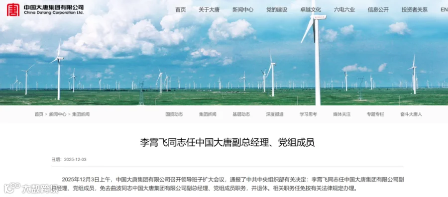 2025年12月3日上午,中国大唐集团有限公司召开领导班子扩大会议,通报了中共中央组织部有关决定:李霄飞同志任中国大唐集团有限公司副总经理、党组成员,免去曲波同志中国大唐集团有限公司副总经理、党组成员职务,并退休。相关职务任免按有关法律规定办理。