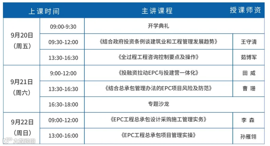 各位同学,您好!《工程建设EPC总承包与全过程工程咨询实战型高级研讨班第47期》定于2019年9月20日-22日于北京·清华园开课。请您合理安排时间,提前联络教务老师。