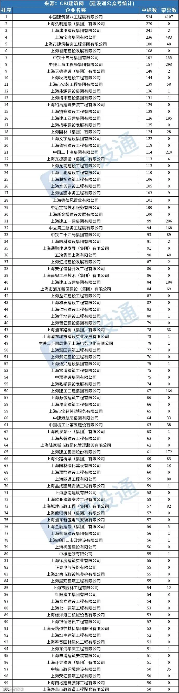 CBI建筑网综合报道在2024年,上海市建筑施工企业中标数量达40330,同比(与去年同期)下降7.73%。其中,中国建筑第八工程局有限公司、上海弘明建设(集团)有限公司、上海建溧建设集团有限公司分列上海市建筑施工企业中标数量排行榜前三位。