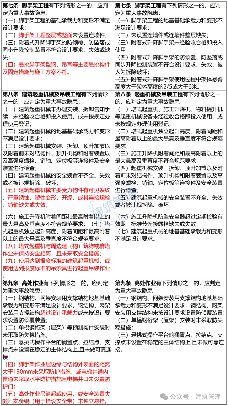 以下内容为2024版本(征求意见稿)与2022版本对比,增加了施工临时堆载和危险作业两大块内容,并且内容细化,增加了隐患情形。
