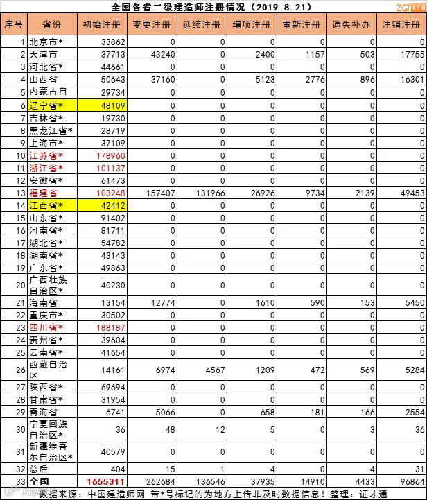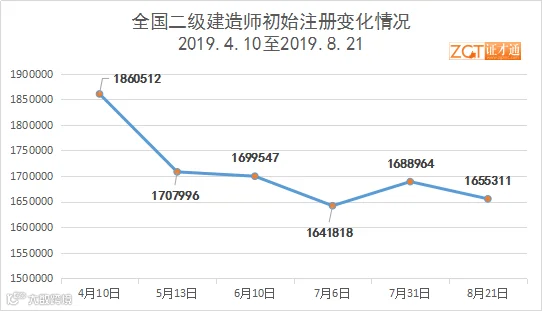 截止8月21日,全国二建初始注册总量为1655311人。