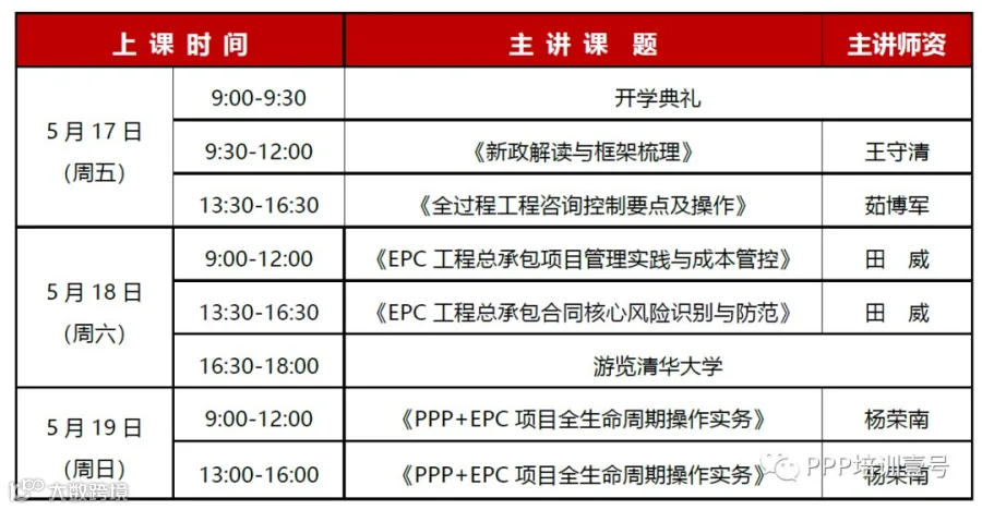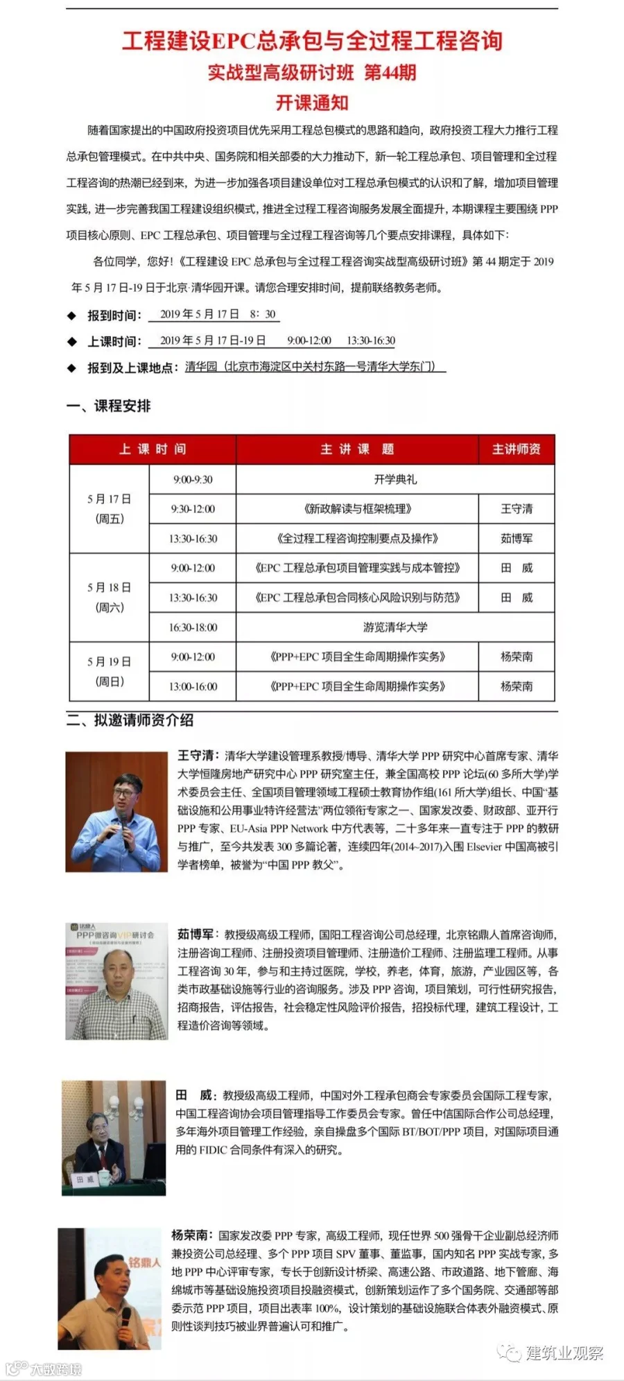 各位同学,您好!《工程建设EPC总承包与全过程工程咨询实战型高级研讨班第44期》定于2019年5月17日-19日于北京·清华园开课。请您合理安排时间,提前联络教务老师。