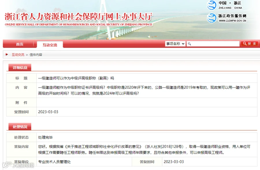 此前,有网友在浙江省人社厅咨询“一级建造师可以作为中级评高级职称(副高)吗”,官方作出回答。