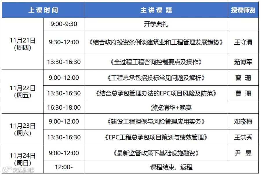各位同学,您好!《工程建设EPC总承包与全过程工程咨询实战型高级研讨班第48期》定于2019年11月22日-24日于北京·清华园开课。请您合理安排时间,提前联络教务老师。