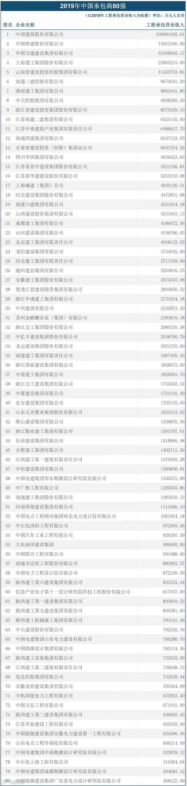 2019年11月8日,美国《工程新闻记录》(ENR )和中国《建筑时报》主办的2019中国承包商80强排行榜正式发布,80家建筑强企上榜。