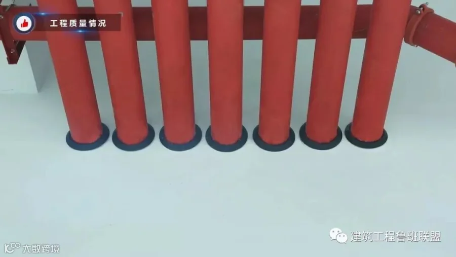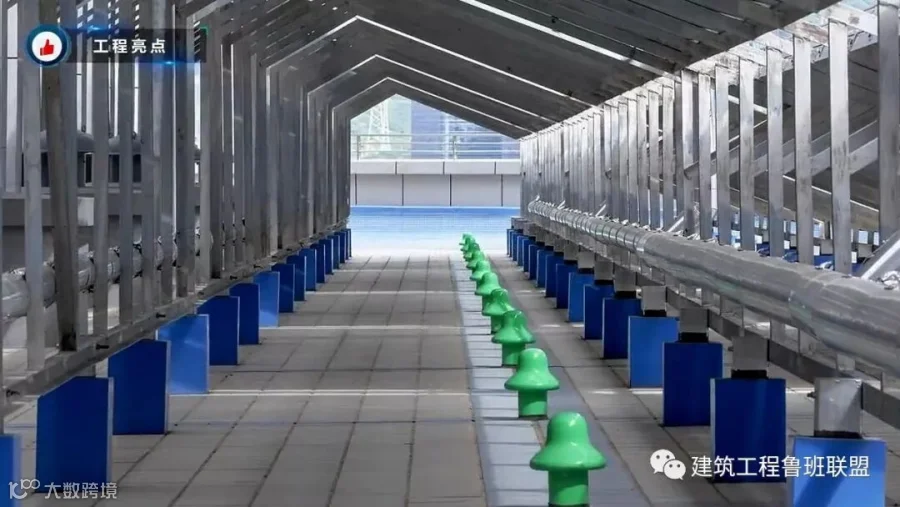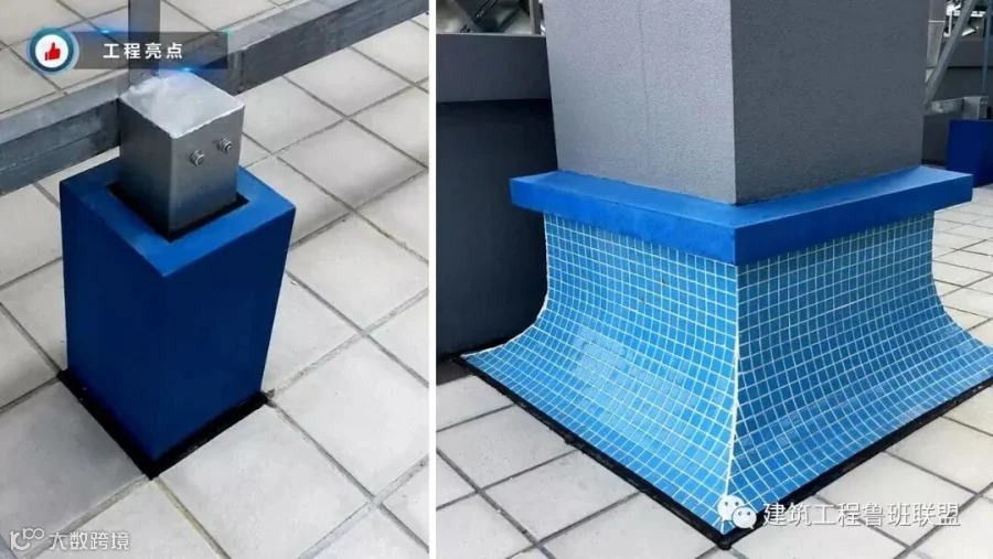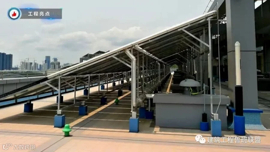 ✔ 屋面坡度合理,饰面砖铺贴整齐,泛水弧度统一顺直,设备管道成排成线,细部构造精美