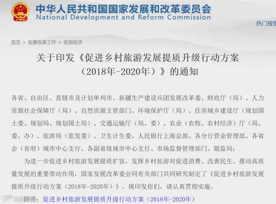 以下为《促进乡村旅游发展提质升级行动方案(2018年-2020年)》全文: