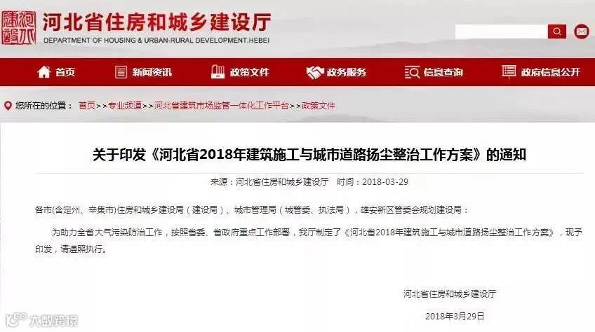 印发关于《河北省2018年建筑施工与城市道路扬尘整治工作方案》的通知,继续深化建筑工地扬尘专项整治工作,全省建筑工地扬尘整治达标率达到100%