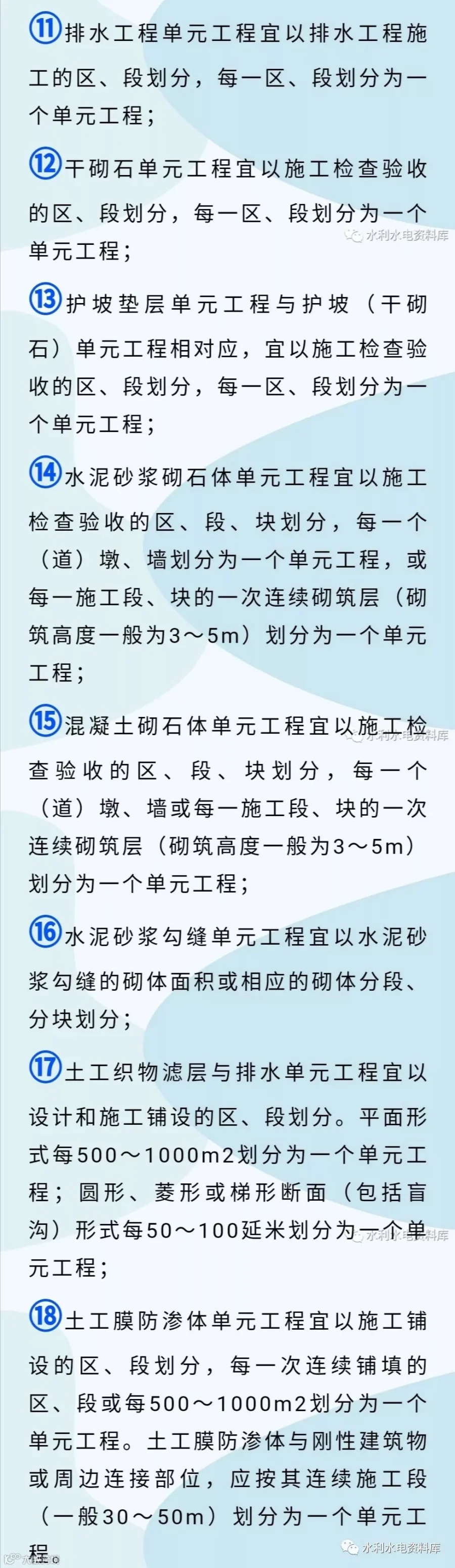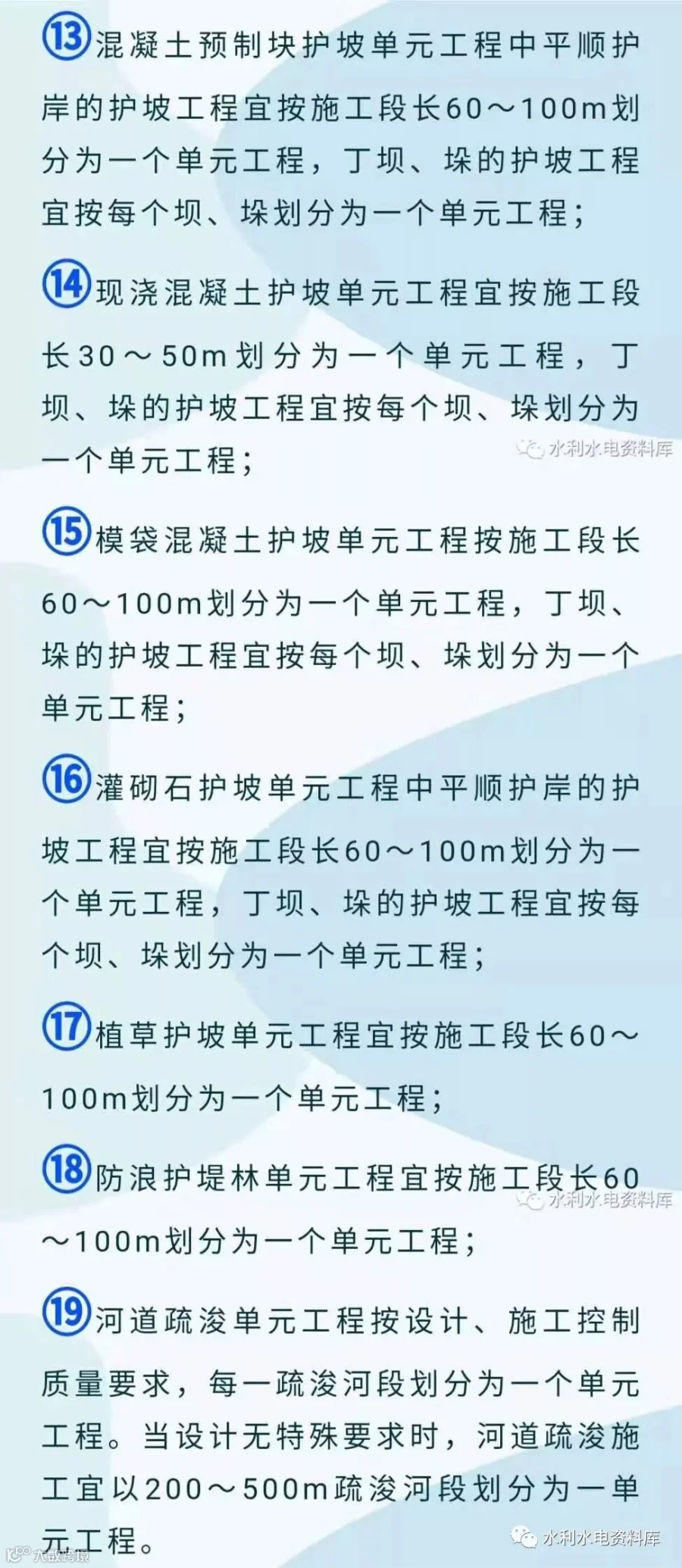 ⑧土工织物铺设单元工程应与护坡单元划分相对应,平顺护岸工程宜按施工段长60~100m划分为-个单元工程,现浇混凝土宜按施工段长30~50m划分为一个单元工程;丁坝、垛的护坡工程宜按每个坝、垛划分为一个单元工程;