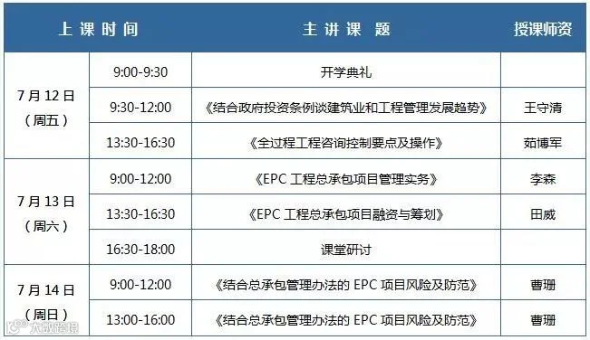 各位同学,您好!《工程建设EPC总承包与全过程工程咨询实战型高级研讨班第46期》定于2019年7月12日-14日于北京·清华园开课。请您合理安排时间,提前联络教务老师。