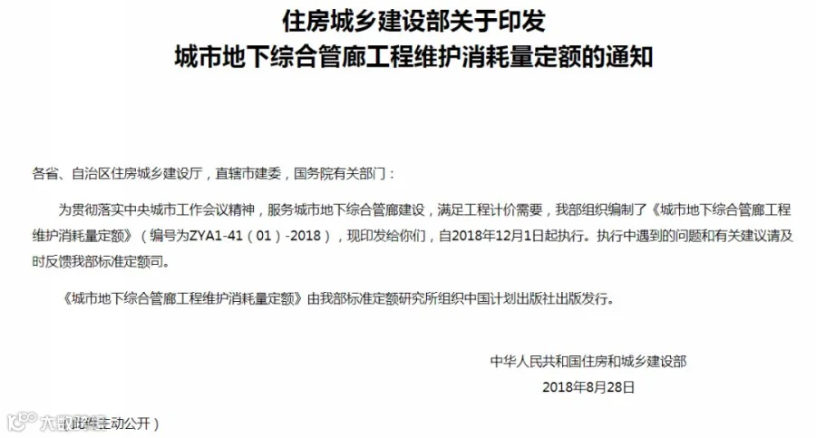 《城市地下综合管廊工程维护消耗量定额》(编号为ZYA1-41(01)-2018)