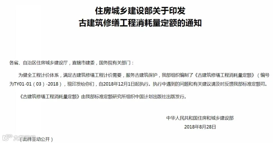 《古建筑修缮工程消耗量定额》(编号为TY01-01(03)-2018)