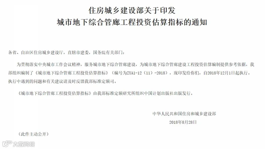 《城市地下综合管廊工程投资估算指标》(编号为ZYA1-12(11)-2018)
