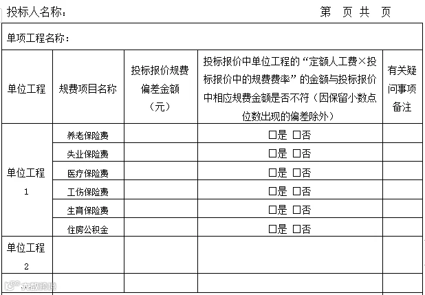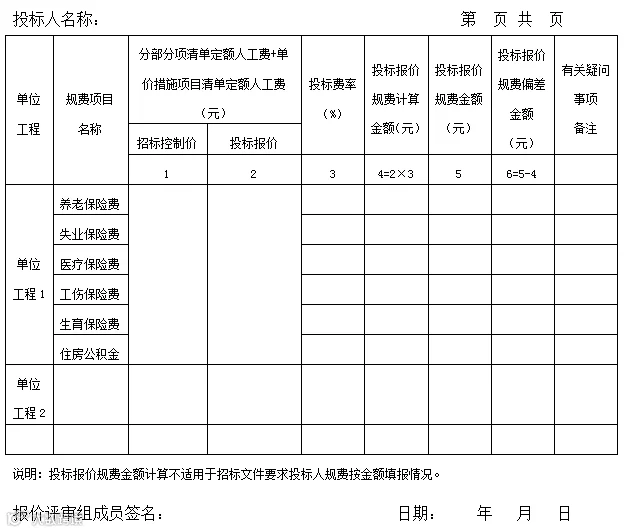 对投标报价中规费明细项目(养老保险费、失业保险费、医疗保险费、工伤保险费、生育保险费、住房公积金)的金额逐项复核,其投标报价中单位工程的“定额人工费(分部分项清单定额人工费+单价措施项目清单定额人工费,下同)×投标报价中的规费费率”的金额与投标报价中相应规费金额不符(因保留小数点位数出现的偏差除外)的,报价评审组应否决其投标。