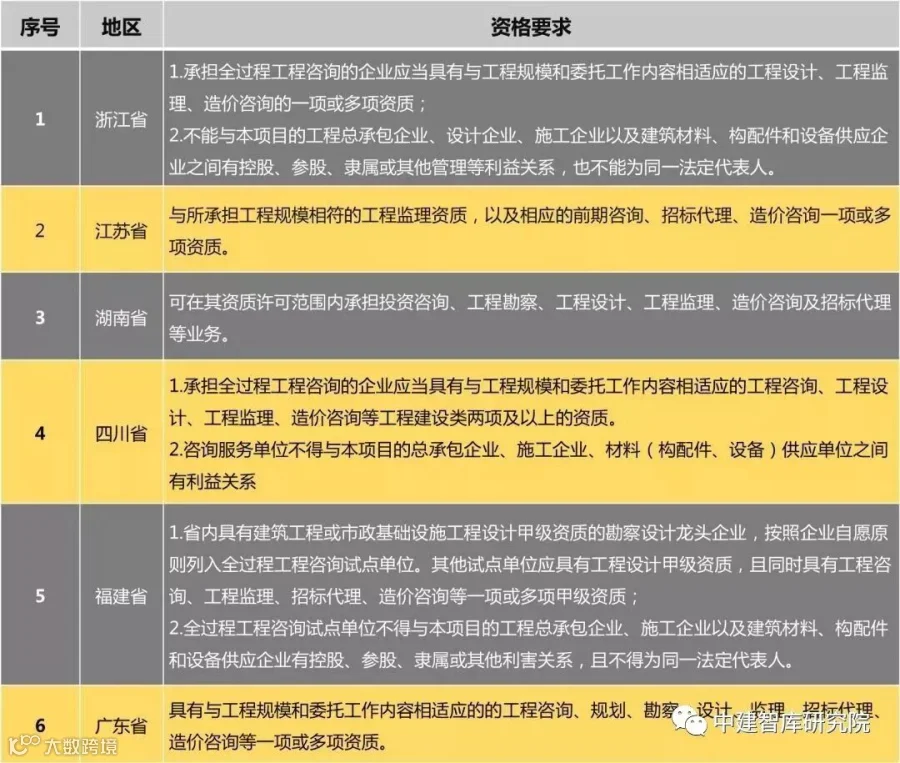 3、资格要求。开展全过程工程咨询服务的企业宜具备与所承担工程规模相符的工程设计、工程监理、造价咨询两项及以上的甲级资质,或具备单一资质且年营业收入在行业排名各省辖市、省直管县(市、港区)前三名的企业。