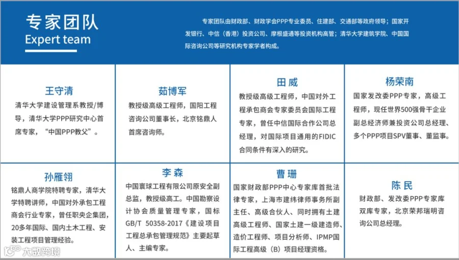 专家团队由财政部、财政学会PPP专业委员、住建部、交通部等政府领导;国家开发银行、中信(香港)投资公司、摩根盛通等投资机构高管;清华大学建筑学院、中国国际咨询公司等研究机构专家学者构成。