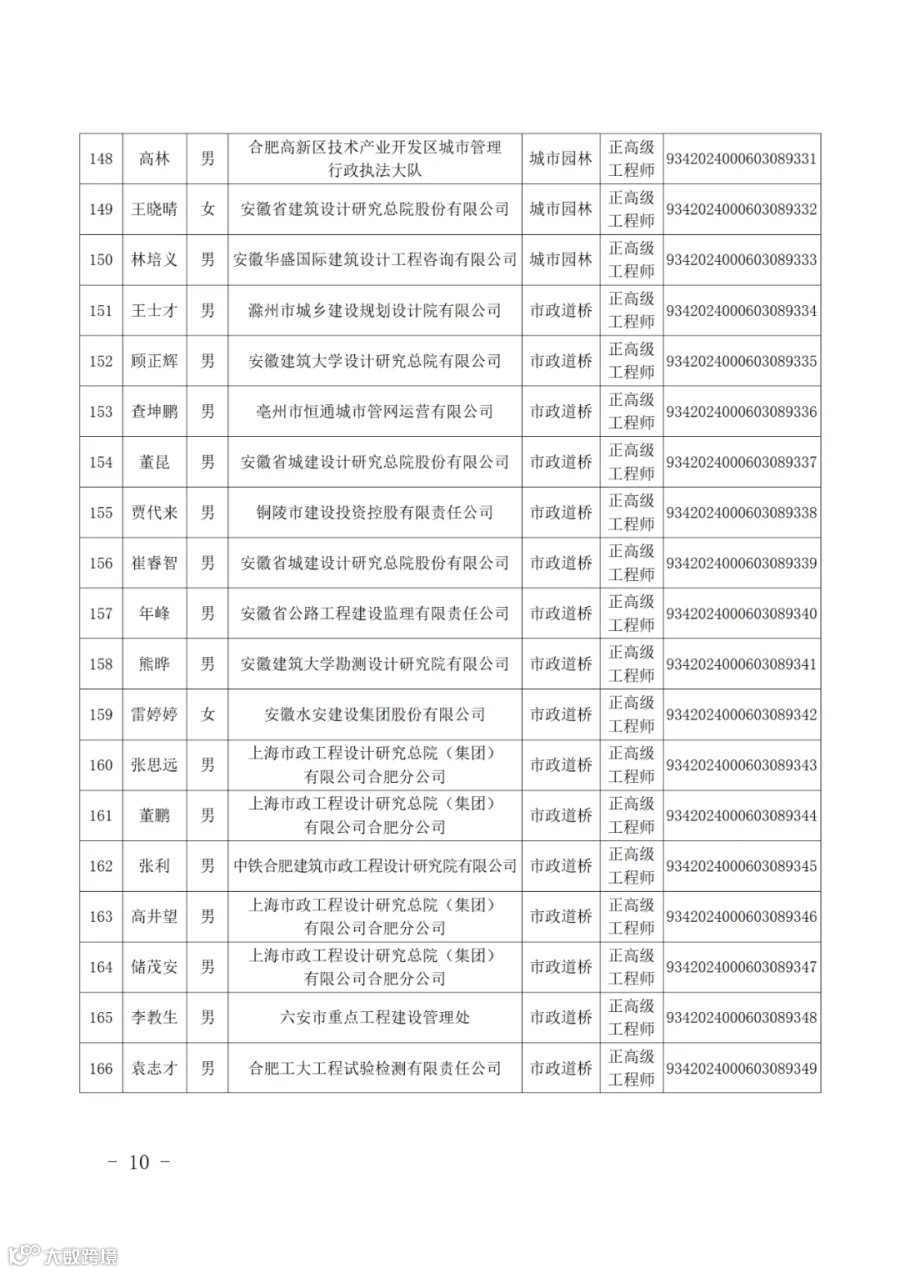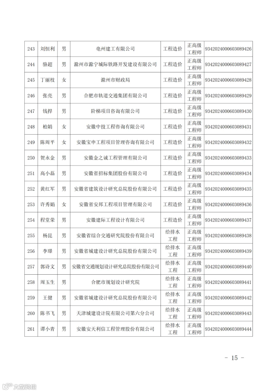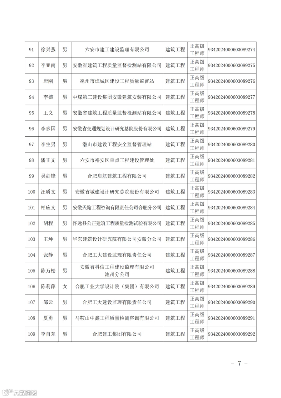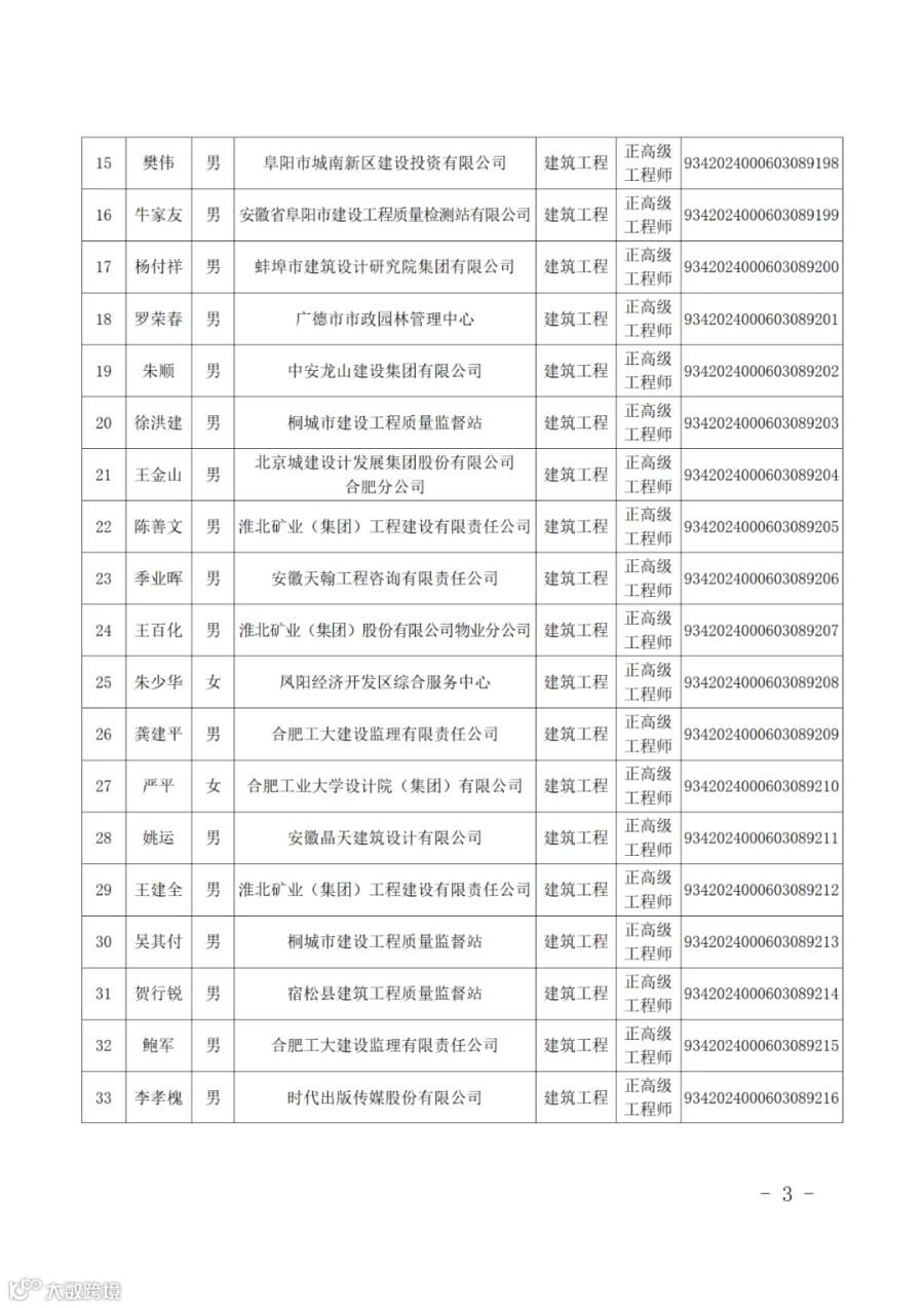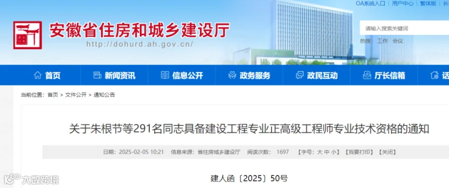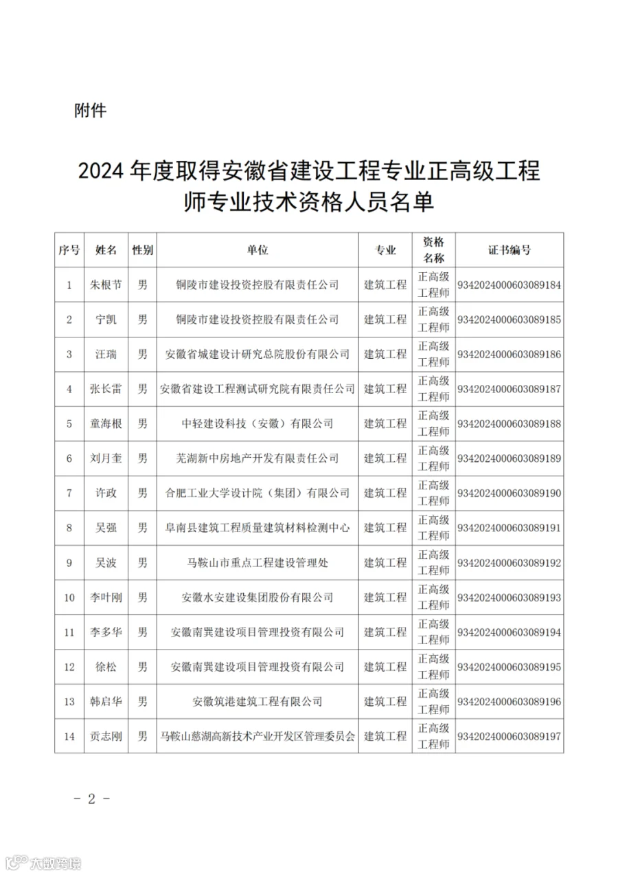 根据《安徽省建设工程专业技术资格评审标准条件》,经安徽省建设工程专业高级职称评审委员会2024年会议评审通过,并经省人力资源和社会保障厅批复同意(皖人社函〔2025〕38号),朱根节等291名同志取得安徽省建设工程专业正高级工程师专业技术资格,取得资格时间从2024年11月21日评委会通过之日算起。