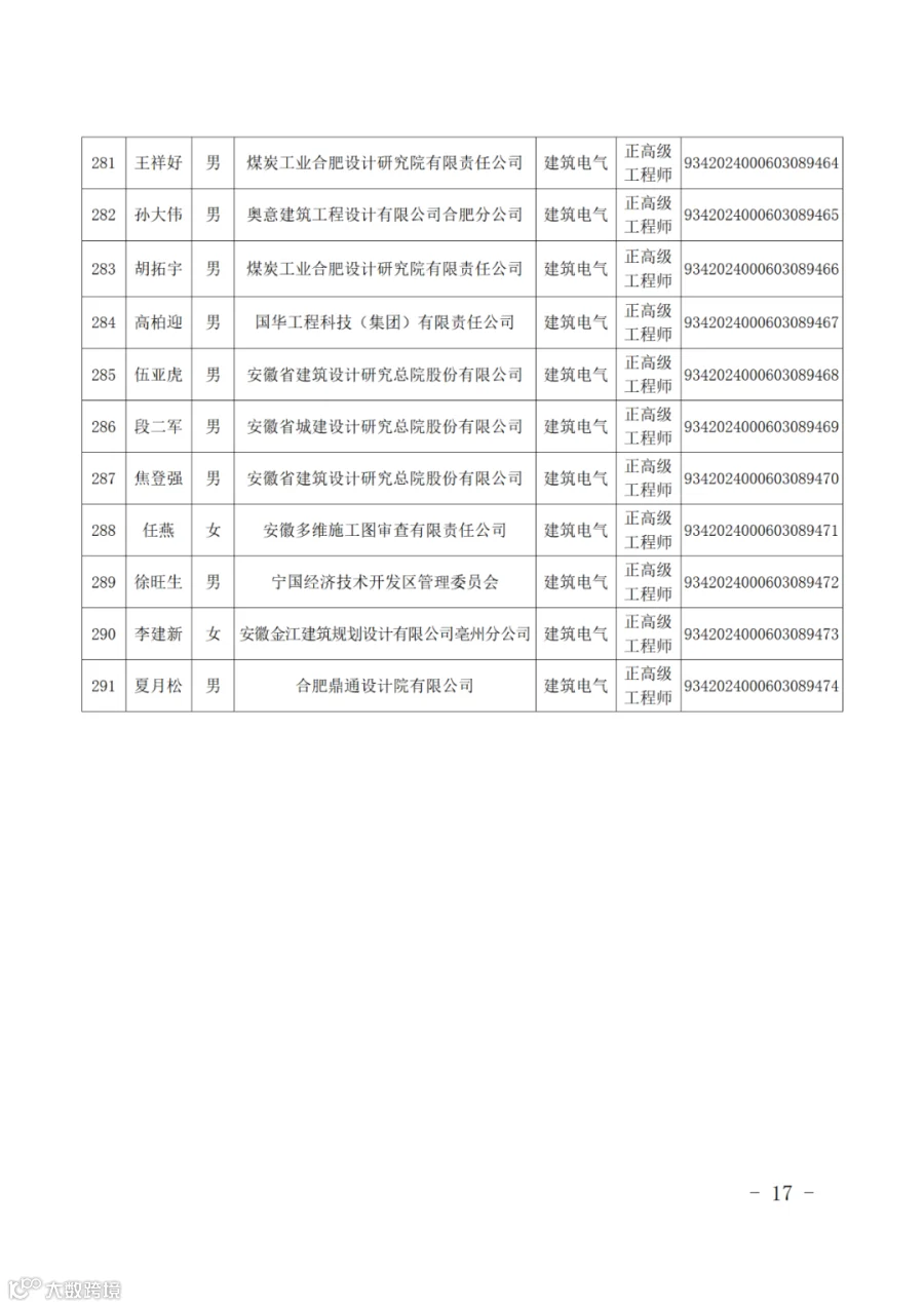 291名同志取得安徽省建设工程专业正高级工程师专业技术资格。