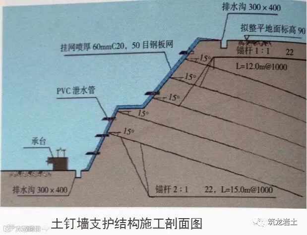 说明:由随基坑开挖分层设置的、纵横向密布的土钉群、喷射混凝土面层及原位土体所组成的支护结构,适用于较浅的基坑。