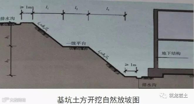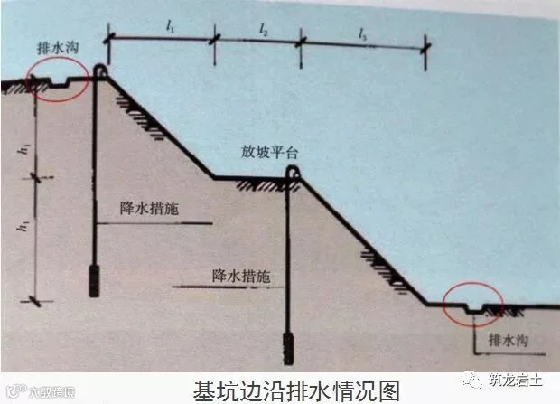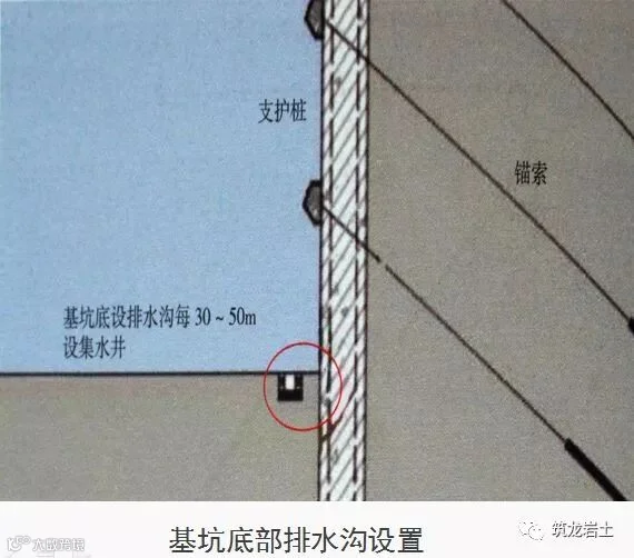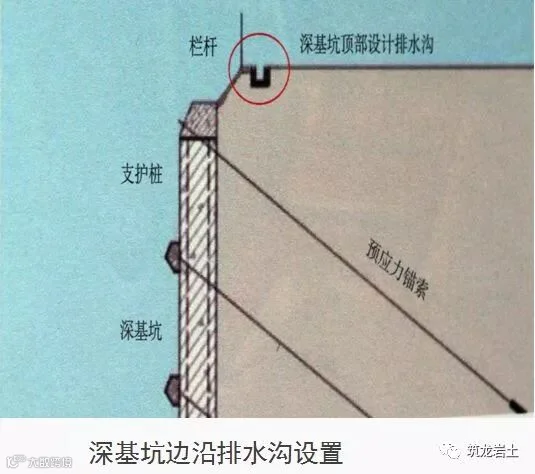 基坑边沿周围地面应设置排水沟;放坡开挖时,应对坡顶、坡面、坡脚采取降排水措施。深基坑边界上部必须设有排水沟,以防止雨水进入基坑。