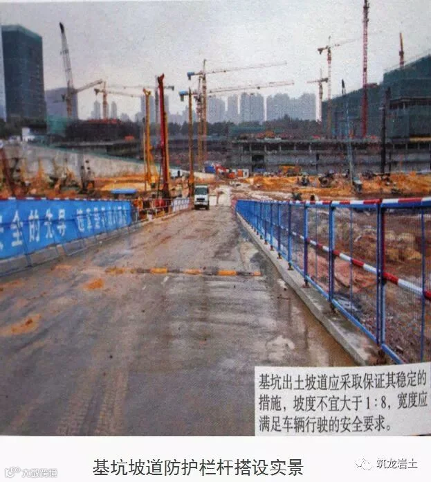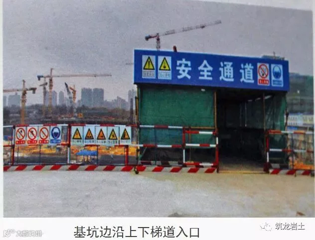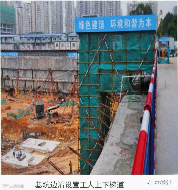 基坑边沿应设置供施工人员上下的专用梯道:梯道应设置扶手栏杆,确保专业人员安全;梯道宽度不应小于lm,梯道的搭设应符合规范要求。