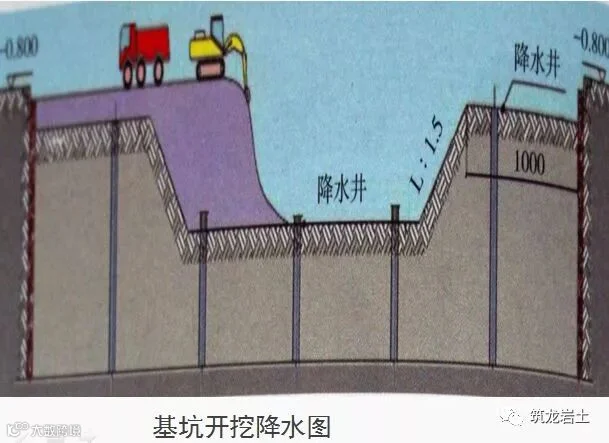 基坑开挖深度范围内有地下水,应采取有效的降排水措施,以确保正常施工。深基坑降水施工应分层降水,随时观测支护外观测井水位,防止邻近建筑物等变形。