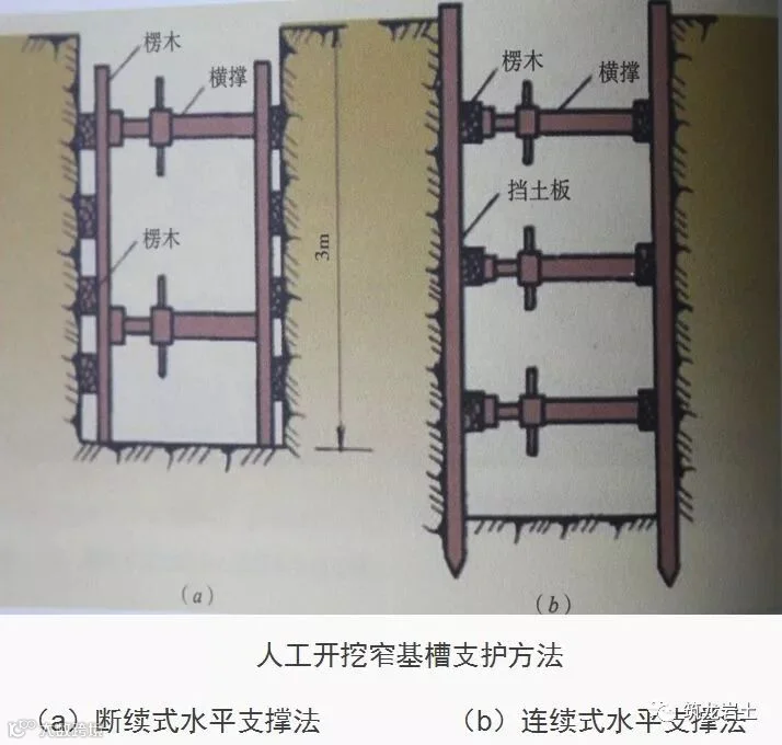 (1)断续式水平支撑法由楞木和工具式横撑组成。楞木间断放置,横撑上下撑牢。用于宽度不大,深度3m以内,且土质含水率低的黏土沟槽开挖的土壁支撑;