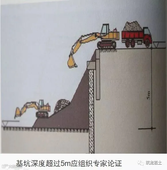 基坑工程施工,开挖深度超过5m的土方开挖、基坑支护及降水工程,或开挖深度虽未超过5m但地质条件、周围环境复杂的土方开挖、基坑支护及降水工程,属超过一定规模的危险性较大的分部分项工程范围。其专项施工方案,除按正常程序审核、审批外,应组织专家对方案进行论证。