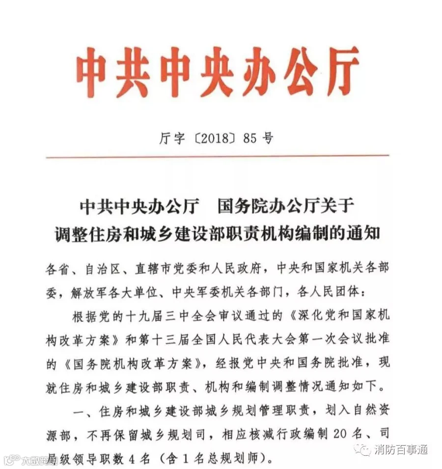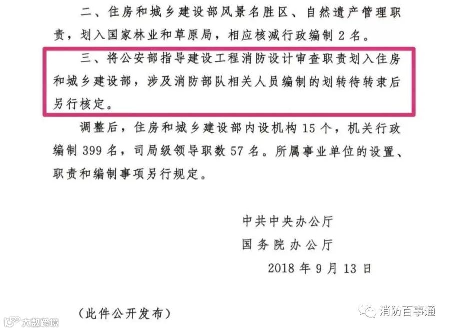 近日,中央办公厅正式发文,将公安部指导建设工程消防设计审查职责划入住房和城乡建设部,涉及消防部队相关人员编制的划转待转隶后另行核定。