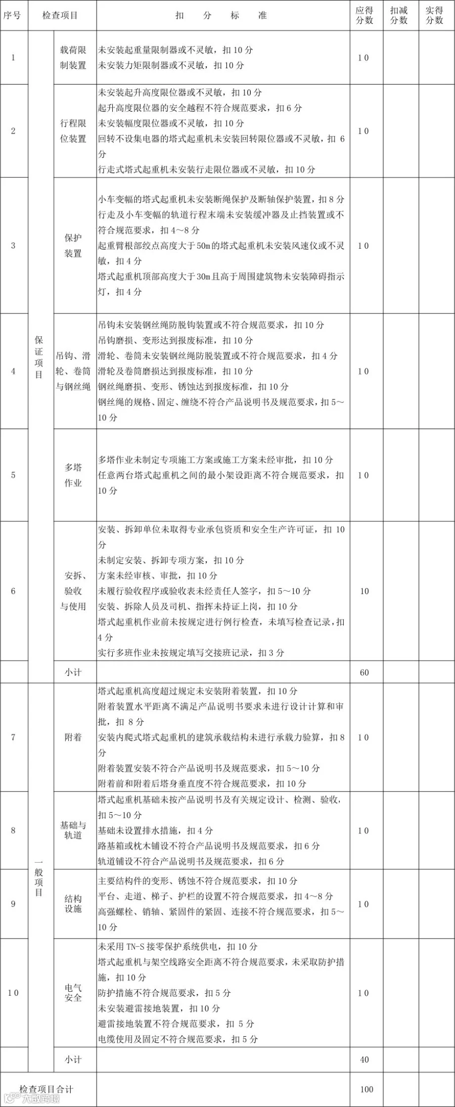 塔式起重机检查评分表