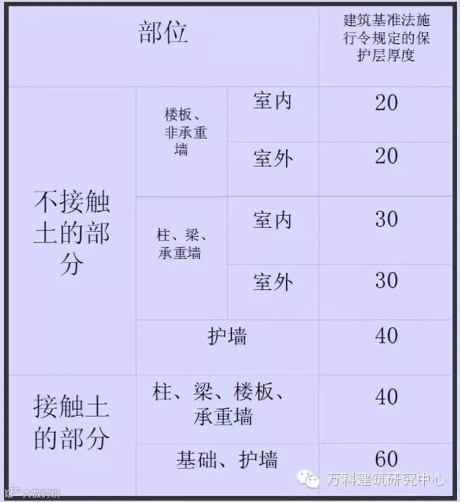 3、混凝土保护层最小厚度(mm) 【注:摘于《建筑基准法》】。