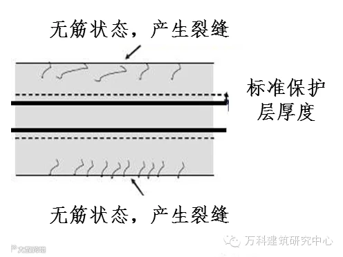 2、保护层过大,使得混凝土处于无筋状态,产生裂缝。