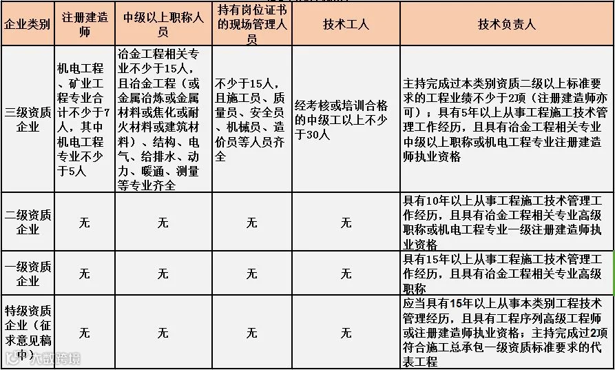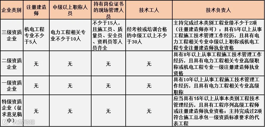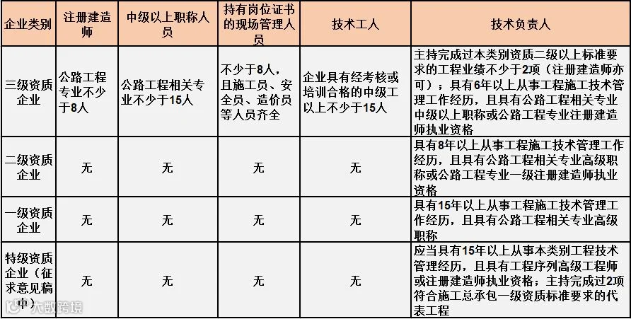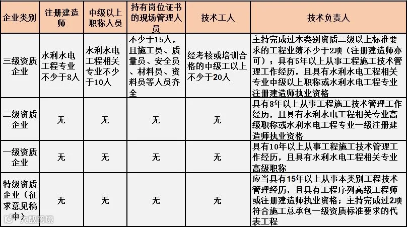 换句话说,并不是所有企业资质都不要求有建造师等企业人员。施工总承包三级资质企业对建造师等人员仍有要求,一级资质、二级资质企业保留技术负责人这一项要求,特级资质另有规定。