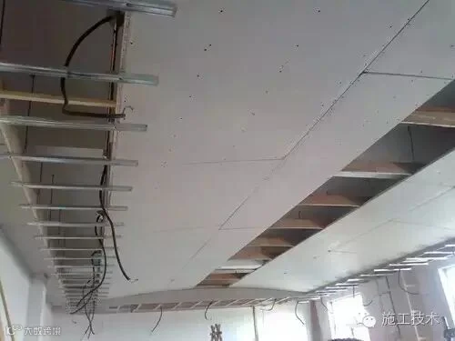 ④吊顶工程:检查吊顶龙骨及吊件材质、规格、间距、连接方式、固定方法、表面防火、防腐处理、处理情况、接缝和连缝情况、填充和吸声材料的品种、规格、铺设、固定情况等。