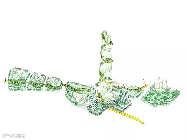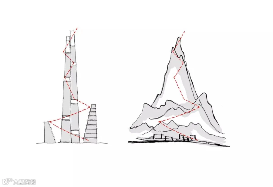 在设计中,超过600米高的“高山之塔”,不仅体现了山峰的巍峨壮丽,还移植了山的连续性和包容性,以及其高效的纵向生态。