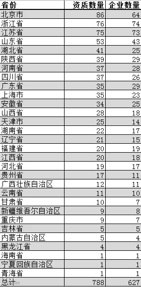从特级资质的地域分布上来看,北京、浙江和江苏依然是前三名,211家企业共拥有237个特级资质。其中,北京特级资质数量最多,达86个;浙江特级资质企业数量最多,达74个。中国内地的31个省、直辖市中,仅西藏尚未拥有特级资质企业。
