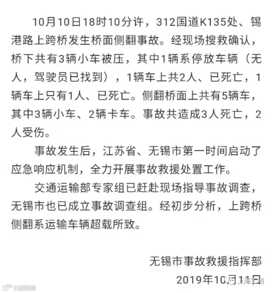 而据事故救援指挥部发布的最新信息,交通运输部专家组已赶赴现场指导事故调查,无锡市也已成立事故调查组。经初步分析,上跨桥侧翻系运输车辆超载所致。